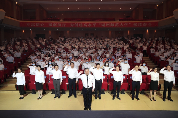 校党委书记金佩华以《重温百年辉煌路 砥砺奋进再出发 以高质量党建引领推动学校高质量发展》为题发表讲话。他指出,学校的命运是与民族和国家的命运息息相关的。学校必须始终坚持党的全面领导,必须始终坚持社会主义办学方向,必须始终坚持以实现民族复兴、国家富强为己任。他表示,近年来,学校各项事业取得了较为丰硕的成果,党的全面领导不断加强、内涵式发展不断提速、党建引领示范成效不断彰显。当前,学校已经站在了新的历史起点上,接下来一段时期,是完成习近平总书记重要嘱托、实现“大学梦”的关键期,是贯彻校第四次党代会精神、落实“三步走”战略目标和“3918”战略体系的关键期,也是学校由教学型向教学研究型大学转型发展的关键期。