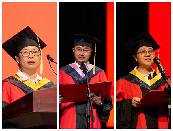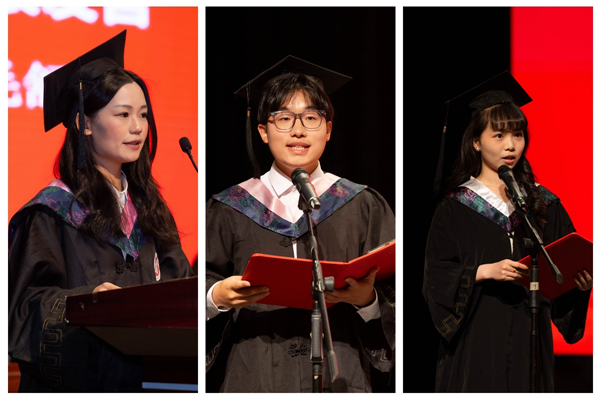 全国大学生外语能力大赛国赛金奖获得者、考取南京大学硕士研究生的外国语学院毛舒怡同学,国家奖学金获得者、优秀学生创业者、考取我校硕士研究生的经济管理学院宋滋同学,国家奖学金获得者、考取上海交通大学硕士研究生的医学院(护理学院)张瑜同学分别作为本科毕业生代表发言。他们深情表达了对母校和师长的感恩之情,并表示将永远铭记恩师的谆谆教诲和“明体达用”的校训精神,在未来的学习和工作中以追光者的姿态勇毅前行,以无畏的勇气追逐心中热爱。