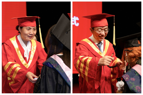 学位授予仪式上,校领导班子成员、教师代表为获得硕士学位和学士学位的学生正冠拨穗、颁发学位证书并合影留念。